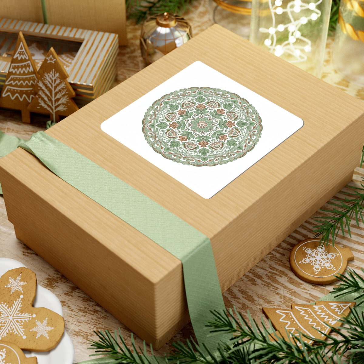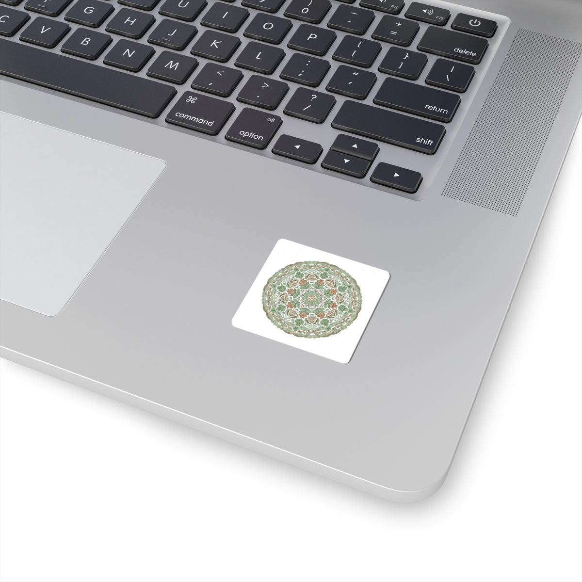Hand-drawn folk-flourish mandala in earthy sage and terracotta tones—a symmetrical ring of stylized birds, vines, and blooms printed on glossy kiss-cut vinyl. The simplified, bold-color execution and ornamental symmetry align with folk-art and Scandi-inspired motifs, bringing a cozy, handcrafted accent to laptops, journals, and home décor surfaces. Subtle, text-free patterning fits cottage and craft-minded aesthetics and works well alongside rustic floral and folk motif collections.