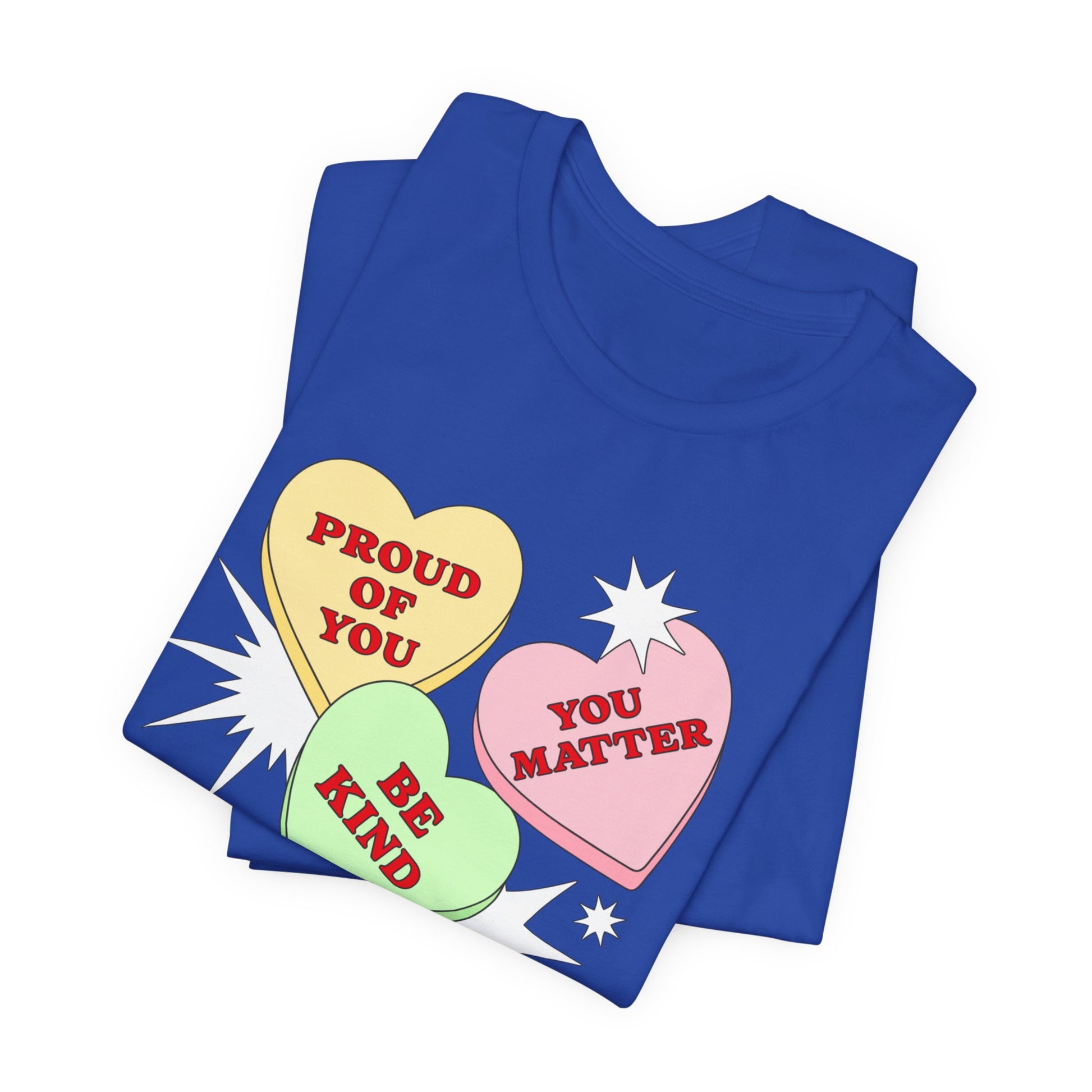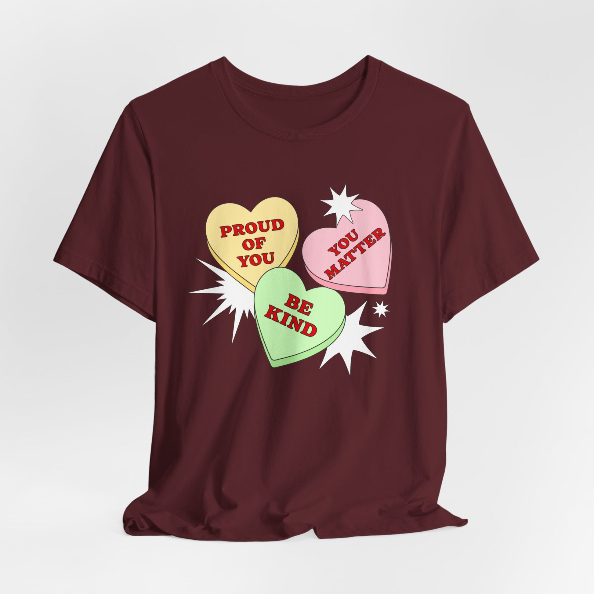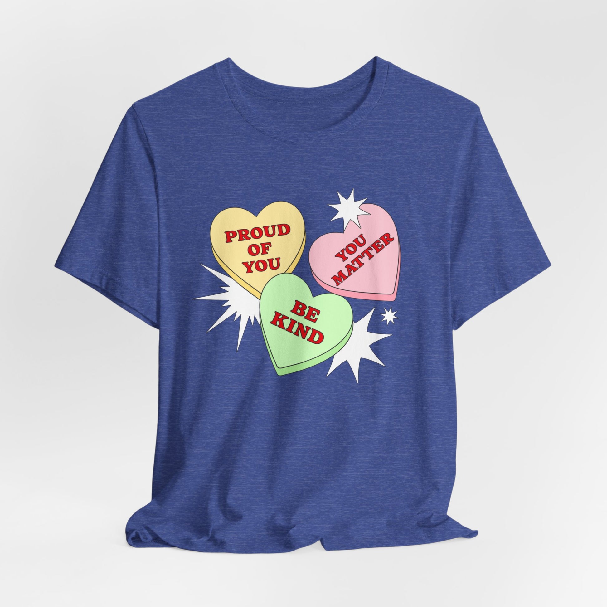 Kindness Conversation Hearts Tee — "Be Kind / Proud of You / You Matter"