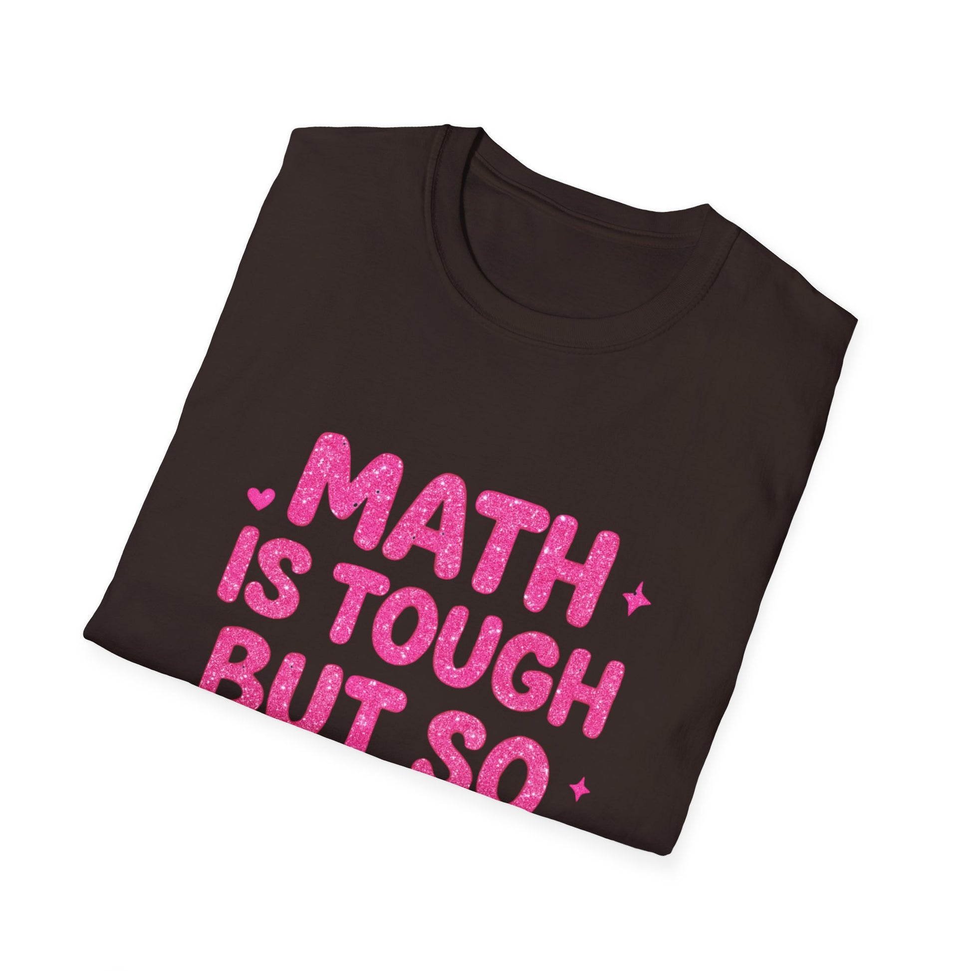 This lightweight cotton tee wears like a quiet pep talk. The front reads “Math is tough but so are you” in playful pink lettering — bold enough to start conversations, soft enough to be part of everyday outfits. Slip it on before a study session, grading marathon, or exam day and feel a small boost of encouragement that’s both visible and sincere. The clean crew neck and classic fit layer easily under cardigans or over hoodies; it’s the kind of shirt students, tutors, and teachers reach for when they want to show resilience with a smile. Washes well, holds print detail, and keeps a smooth, comfortable feel so the message stays front and center.
