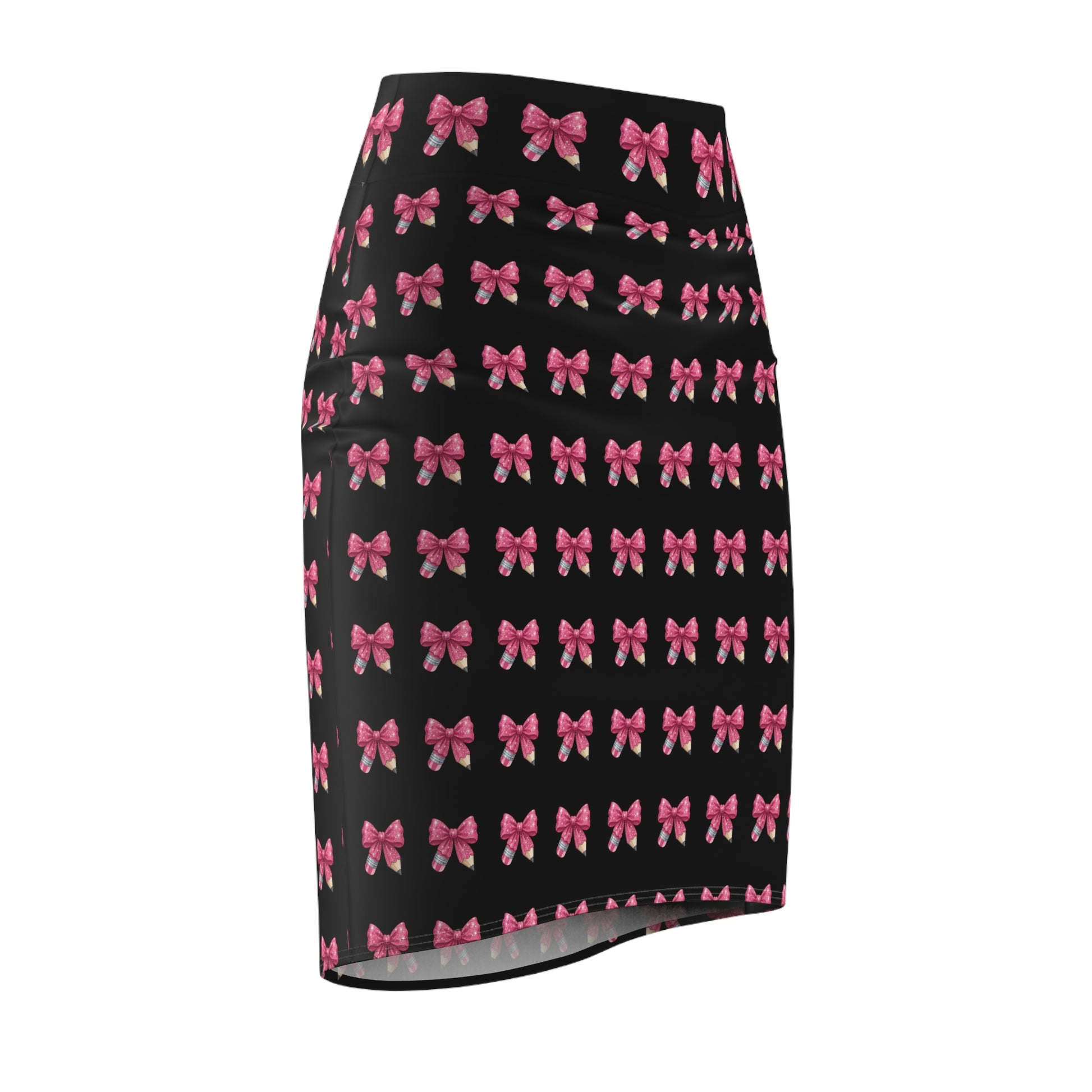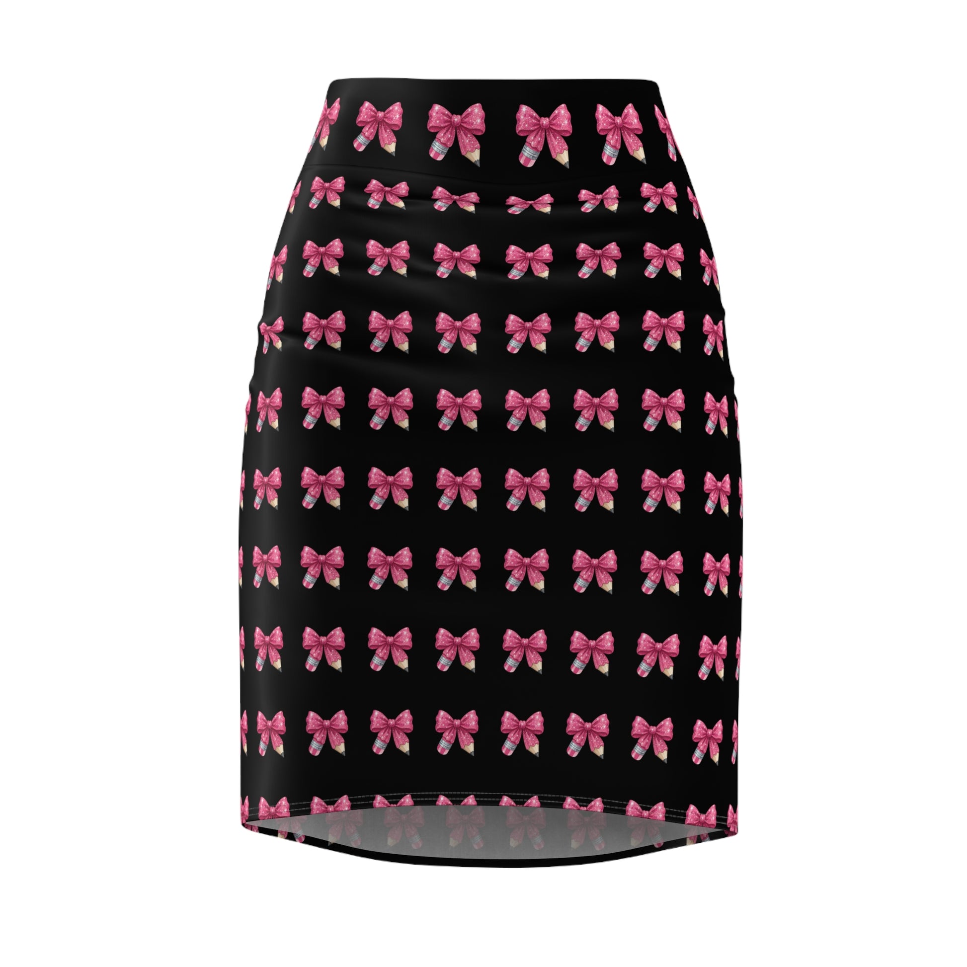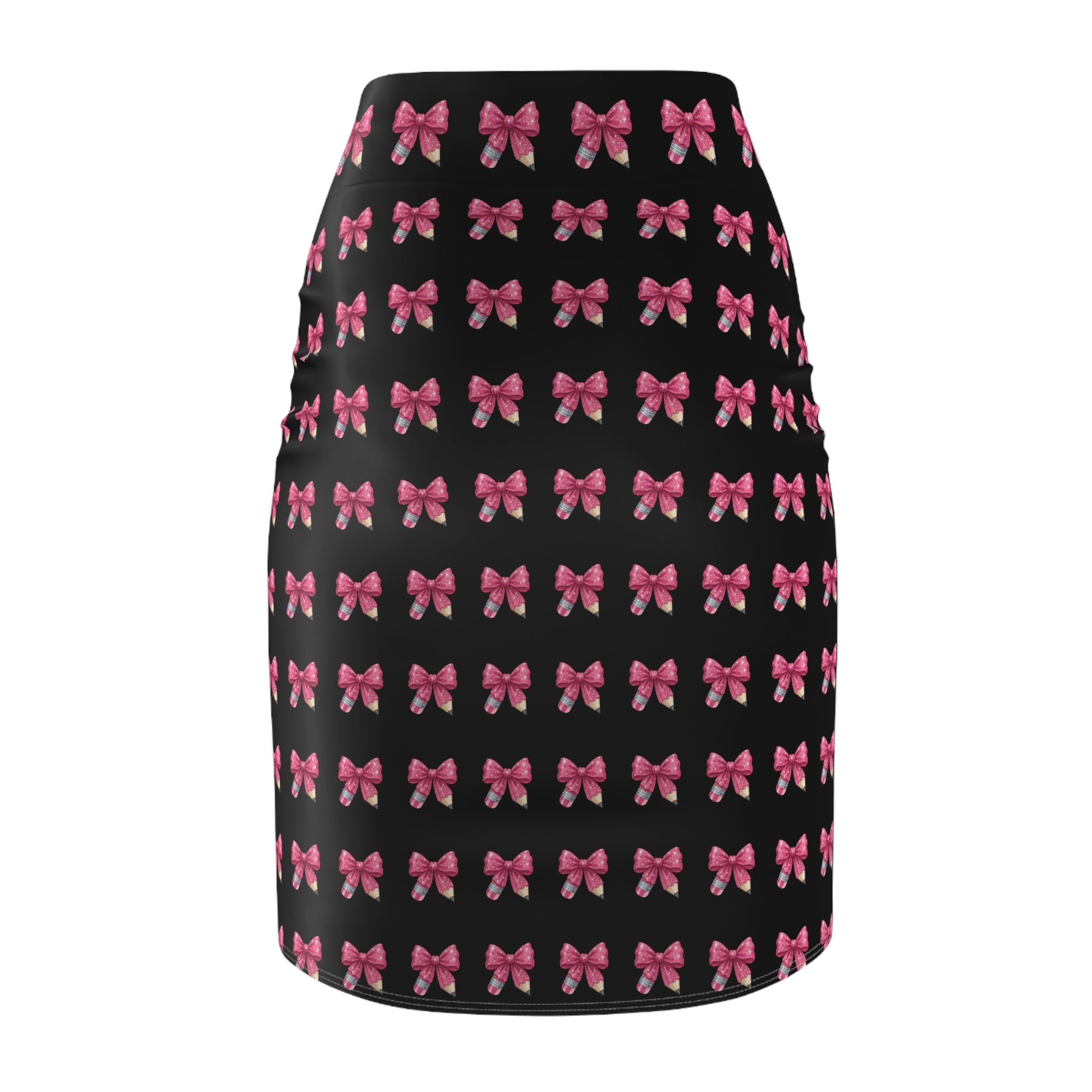 A slim, mid-rise pencil skirt patterned with rows of hand-drawn pink bows on a clean white ground. Lightweight and gently stretchable, it moves with you — hugging curves without restriction thanks to 4-way stretch. The small-scale repeat feels playful and deliberate: wear it when you want a touch of vintage-inspired charm without being loud. Pair with a cropped sweater and loafers for a weekend coffee run, or tuck in a crisp blouse for a desk-to-dinner look. The smooth flatlock seams sit flat against the body, and the all-over print keeps the bows consistent from waist to hem, so the skirt reads like a single thoughtful piece rather than a patchwork. Assembled in the USA from globally sourced parts.