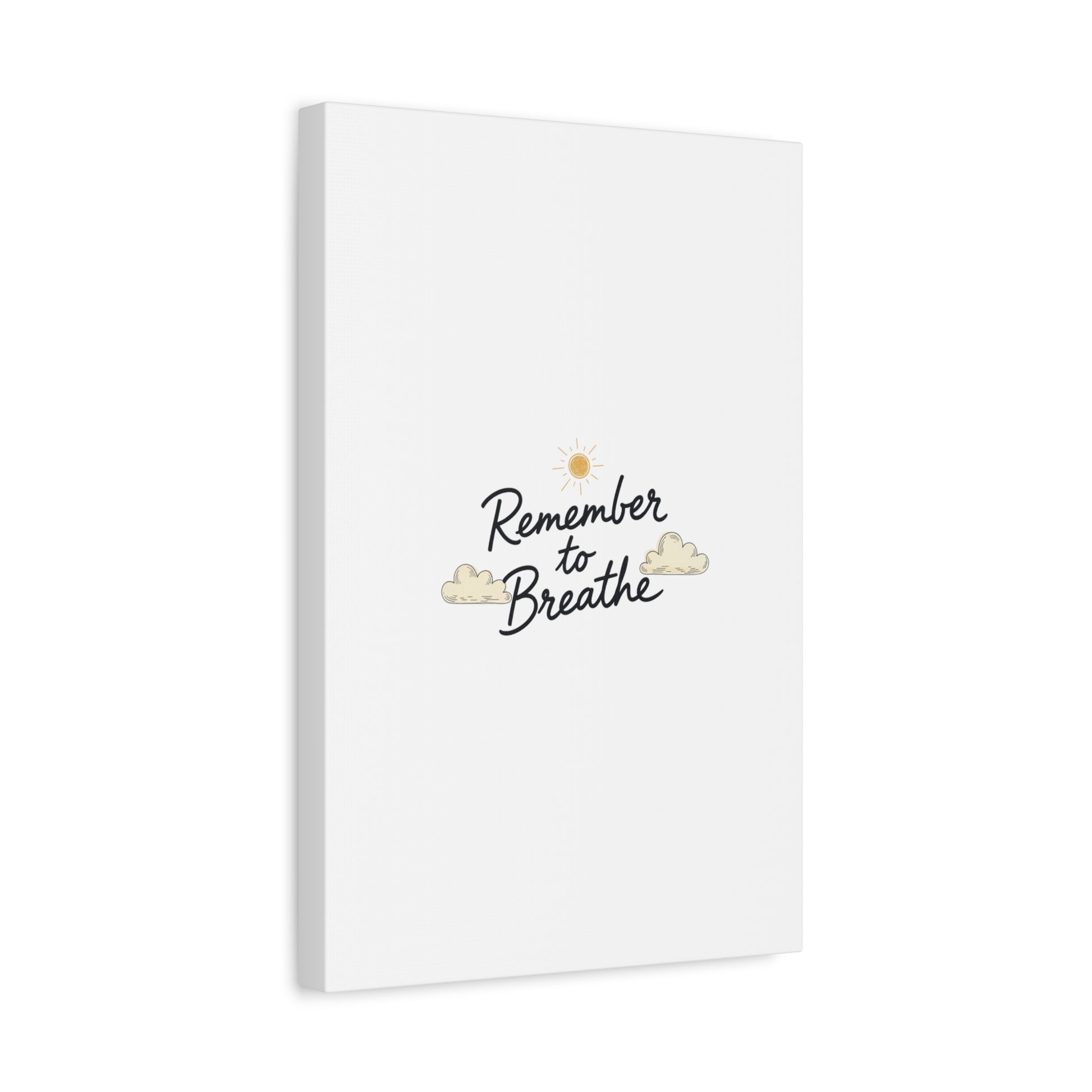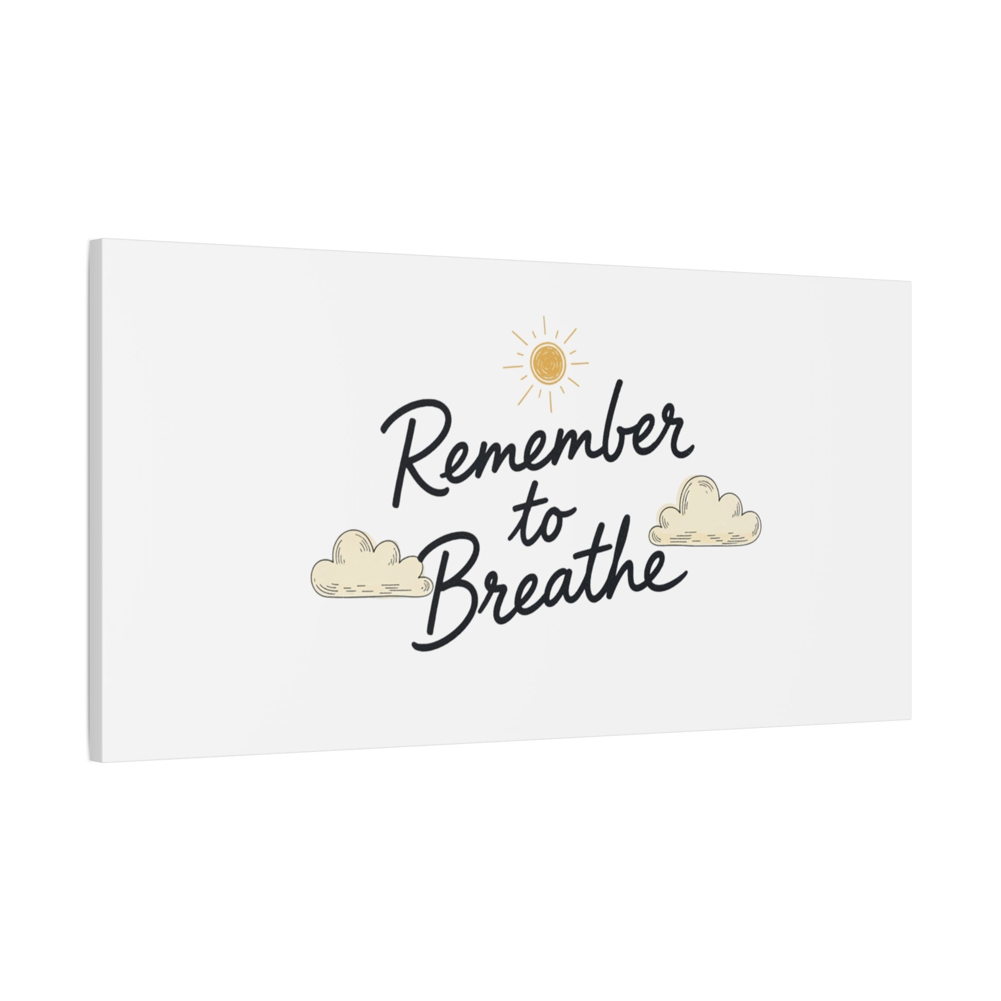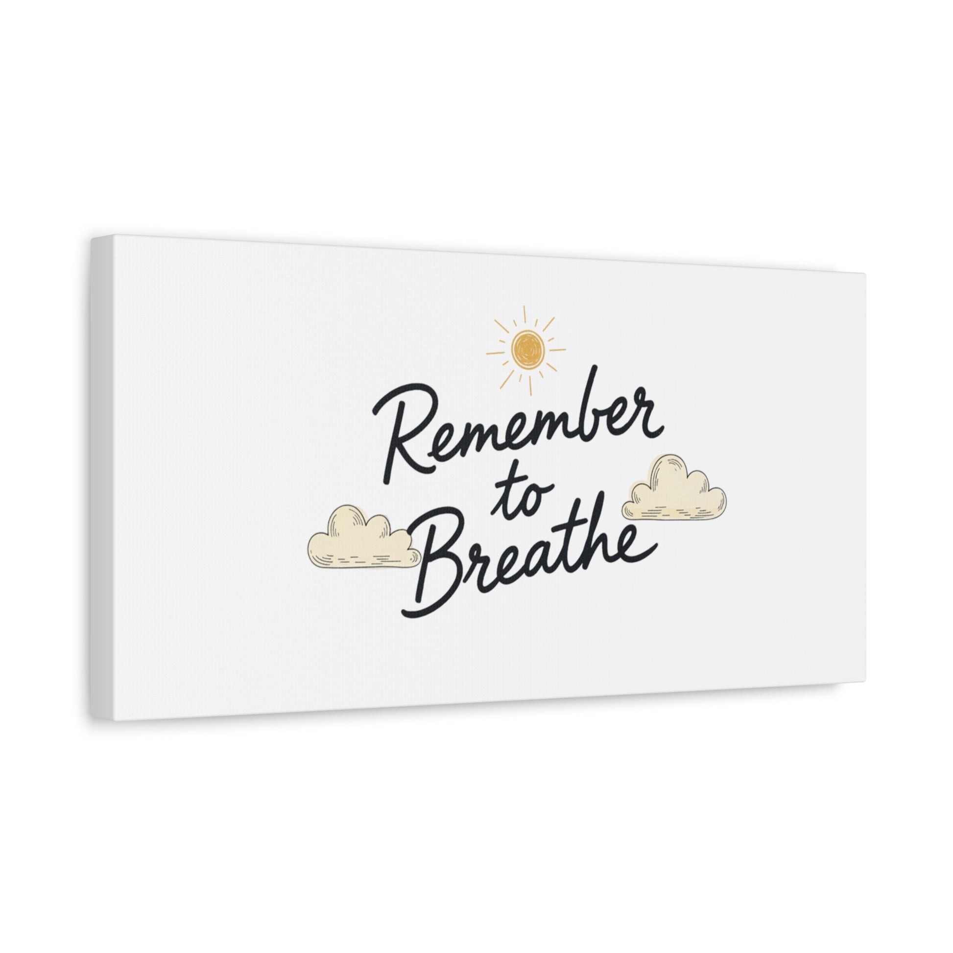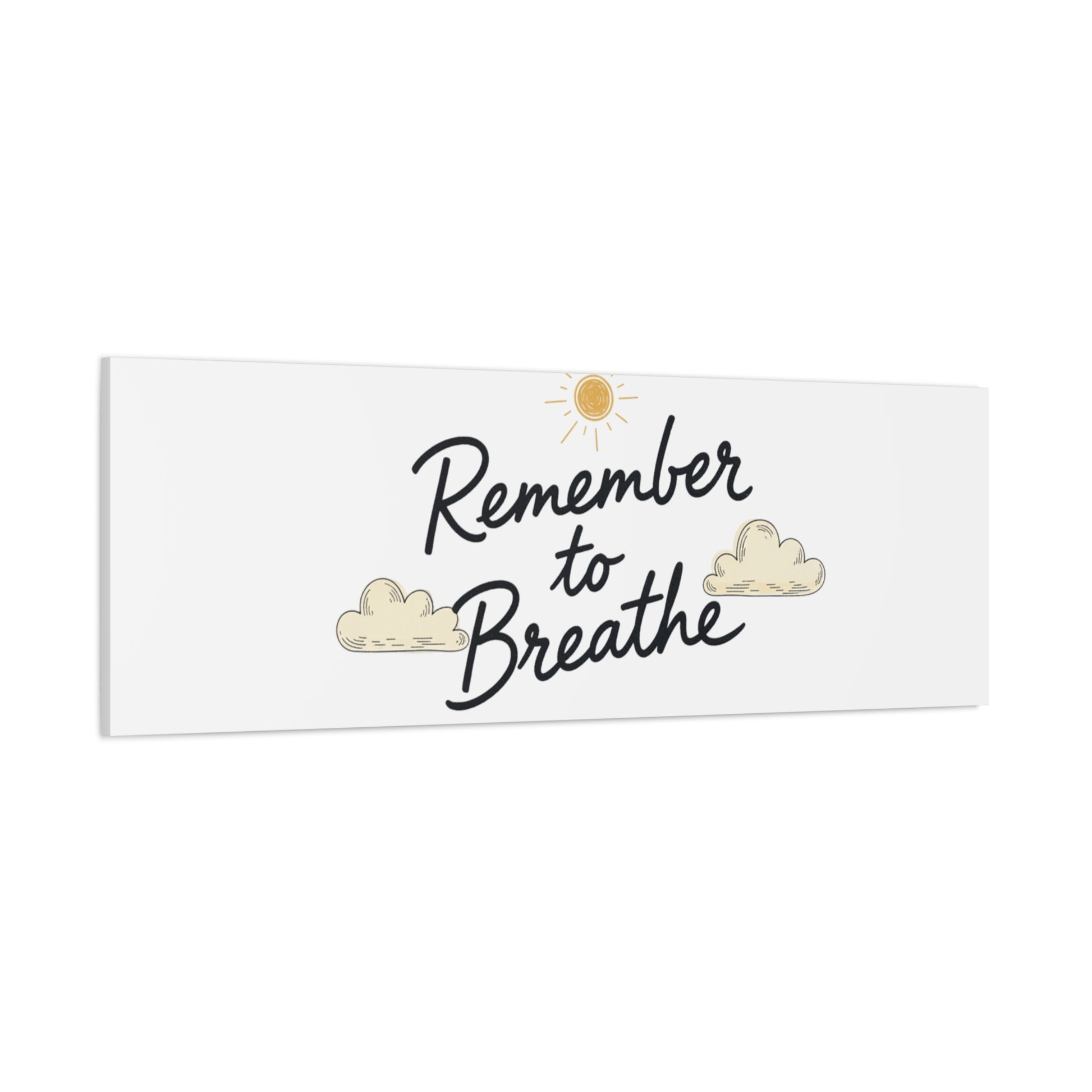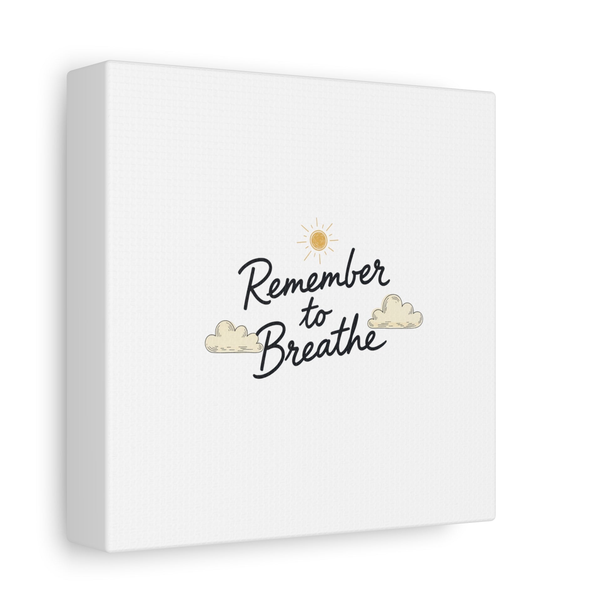 “Remember to Breathe” matte stretched canvas featuring a handwritten-style reminder in warm cream and inky tones. The artwork reads like a quick, analogue note—soft script text framed by a tiny sun and fluffy clouds—giving a gentle, therapy-adjacent vibe that fits the “Note to Self” analogue reminder aesthetic. Its understated palette and DIY-feel lettering make it a calm focal point for a desk nook, study wall, or bedroom where analog self-care cues belong.