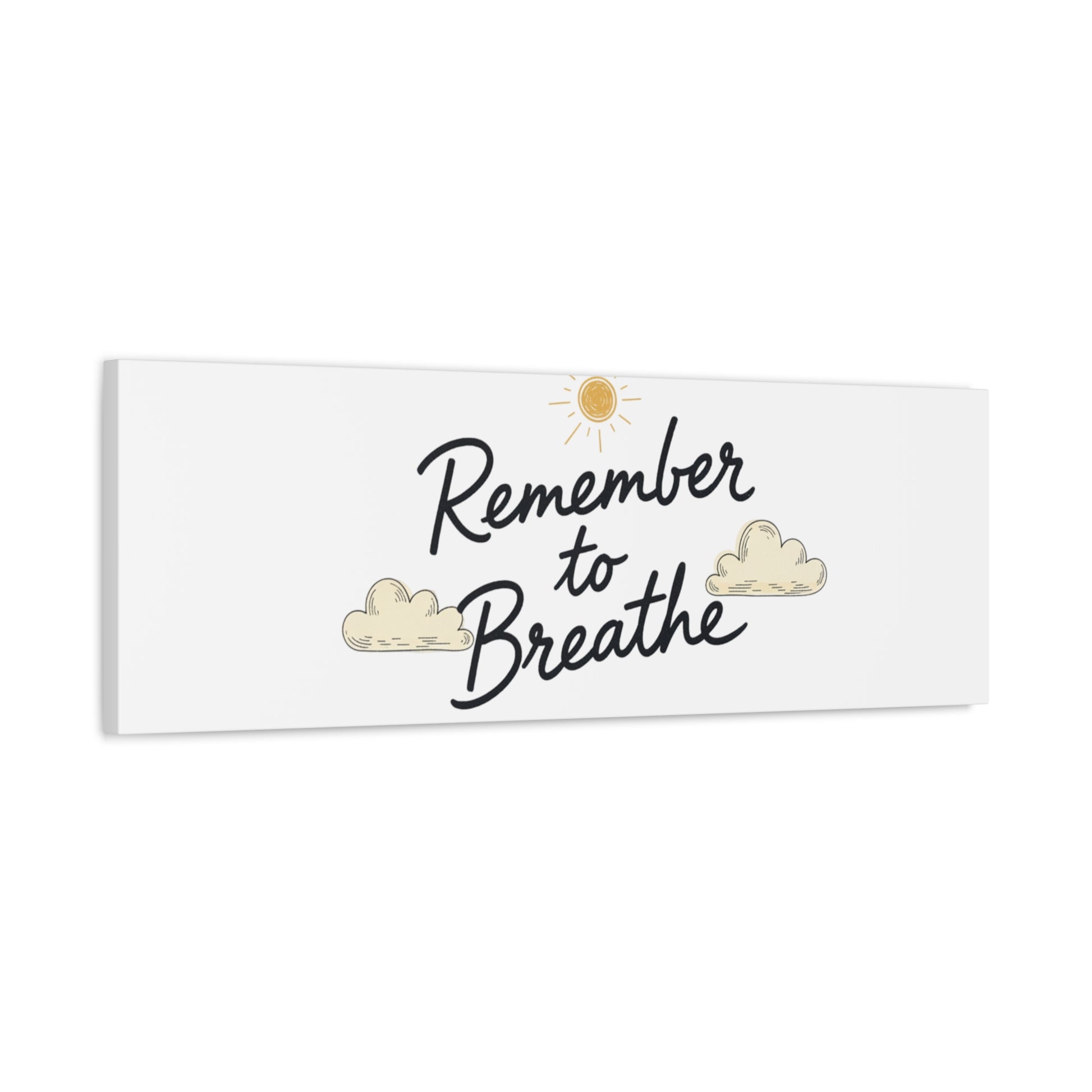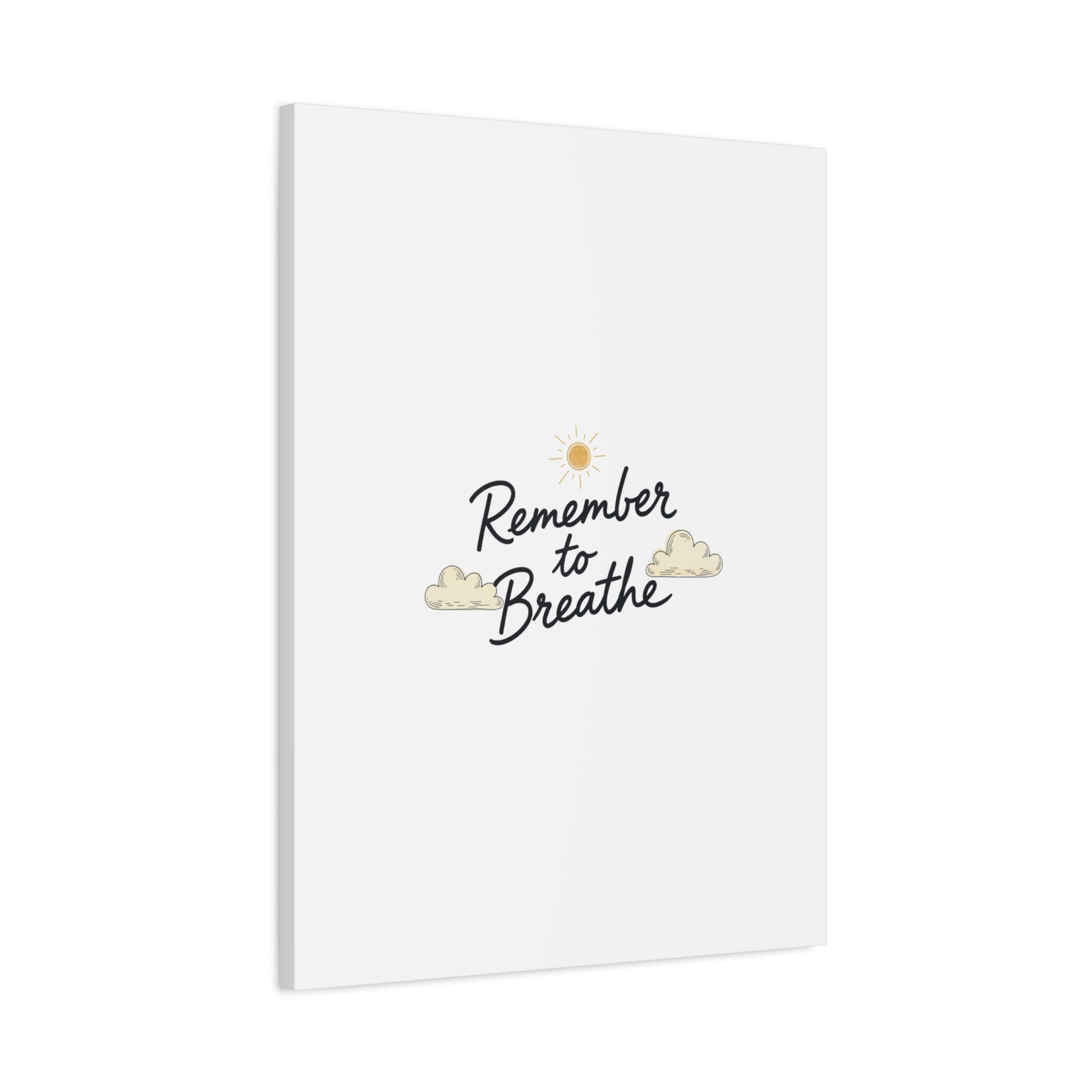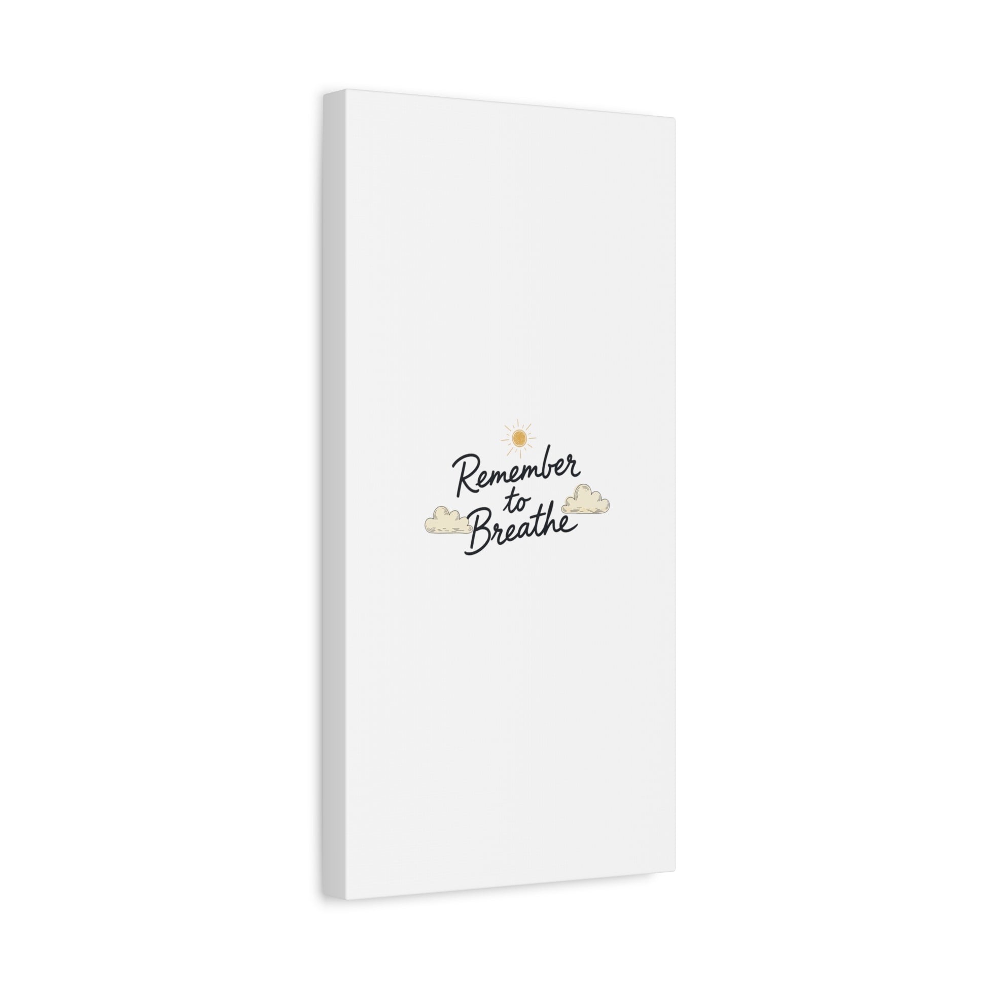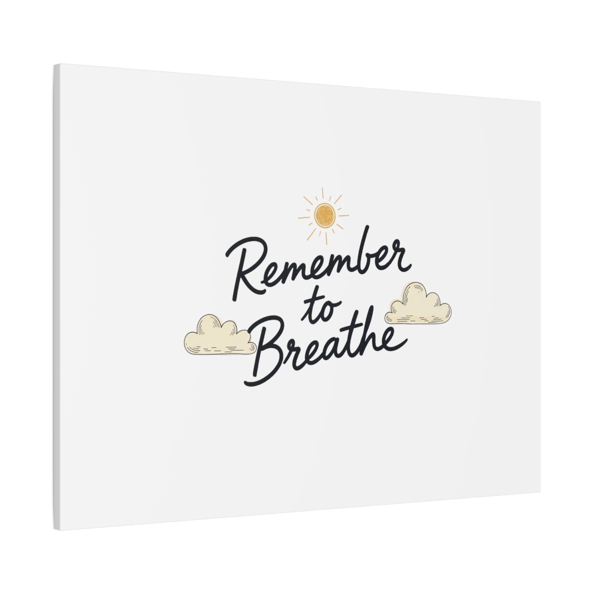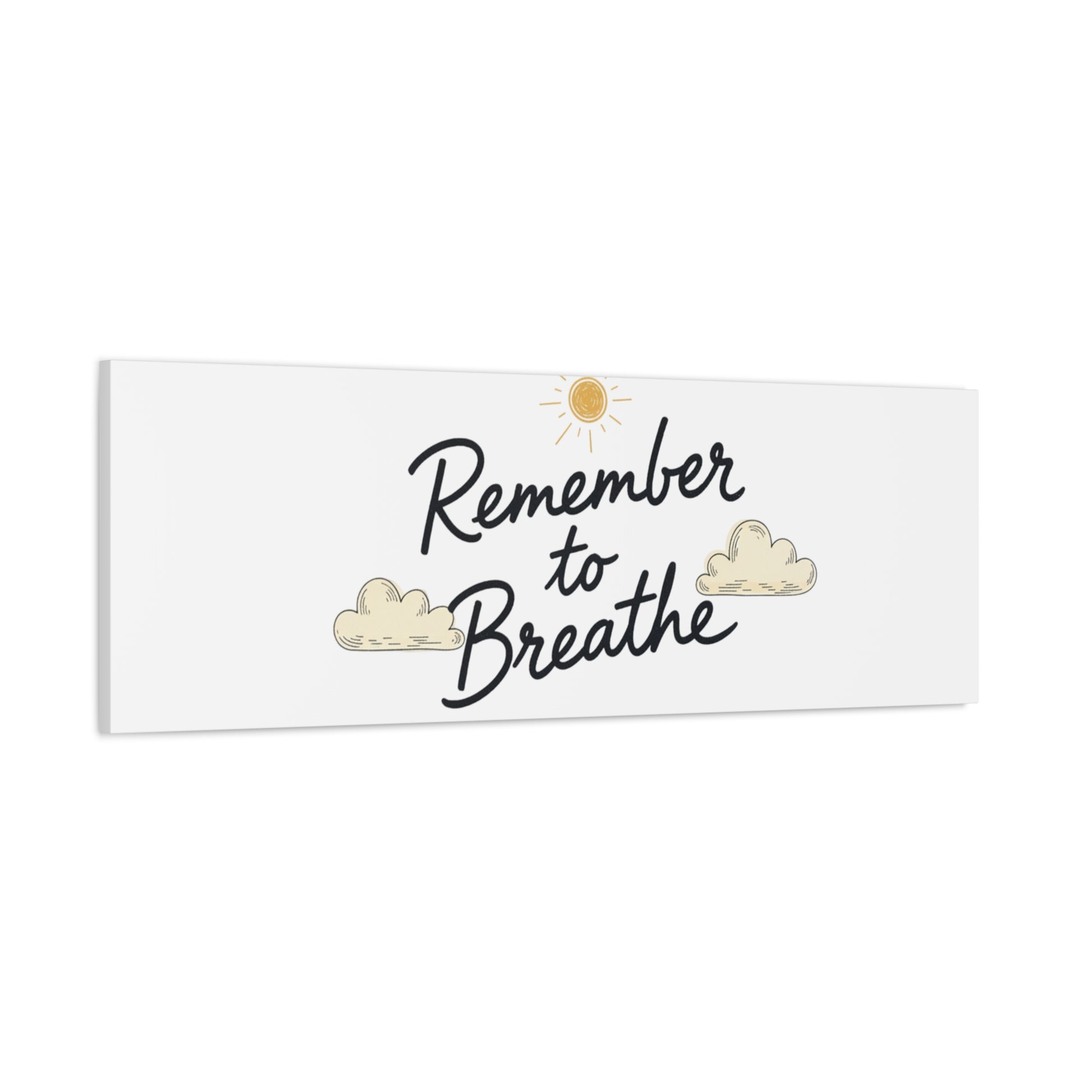 “Remember to Breathe” matte stretched canvas featuring a handwritten-style reminder in warm cream and inky tones. The artwork reads like a quick, analogue note—soft script text framed by a tiny sun and fluffy clouds—giving a gentle, therapy-adjacent vibe that fits the “Note to Self” analogue reminder aesthetic. Its understated palette and DIY-feel lettering make it a calm focal point for a desk nook, study wall, or bedroom where analog self-care cues belong.