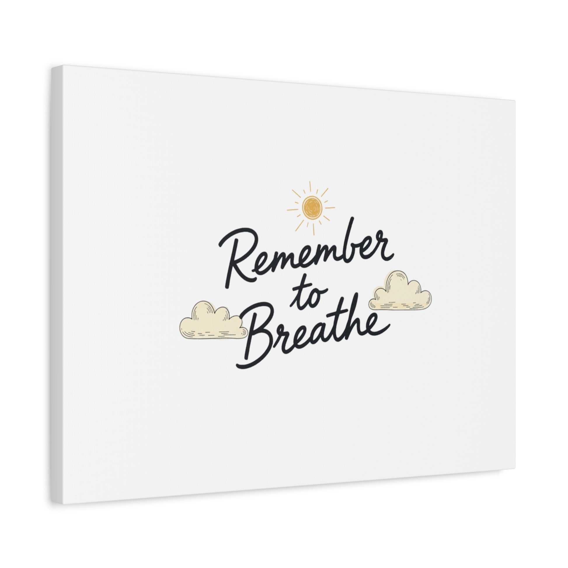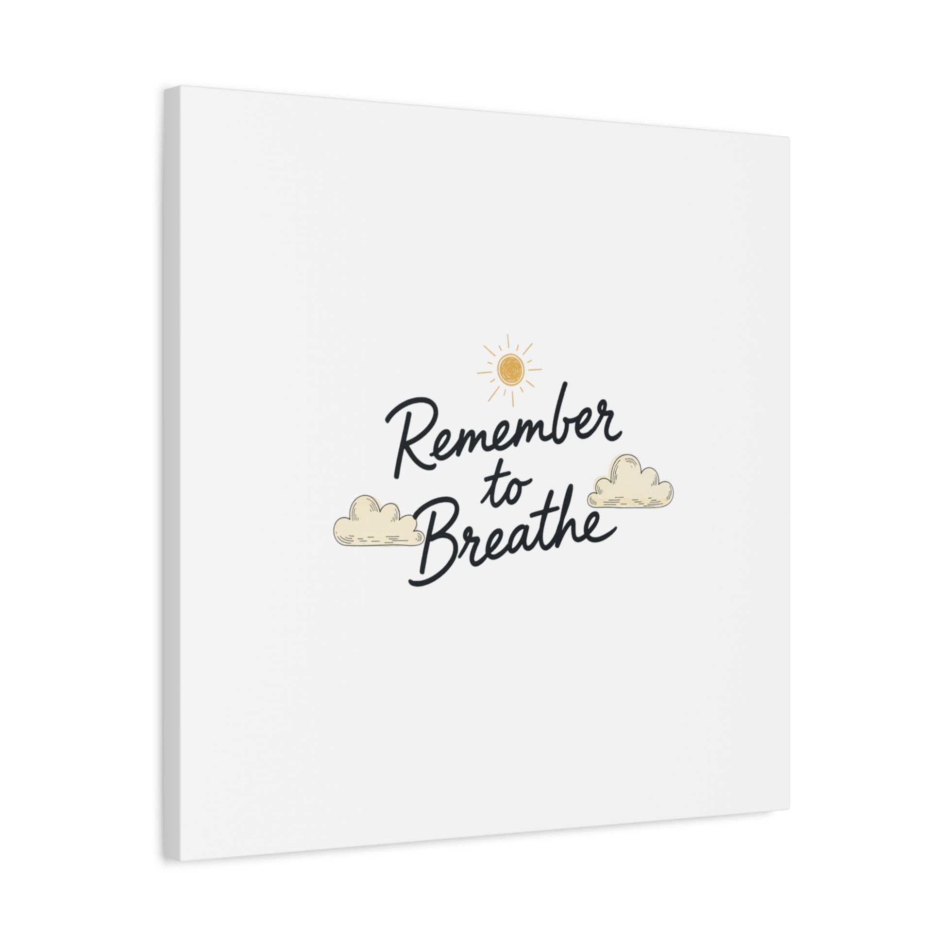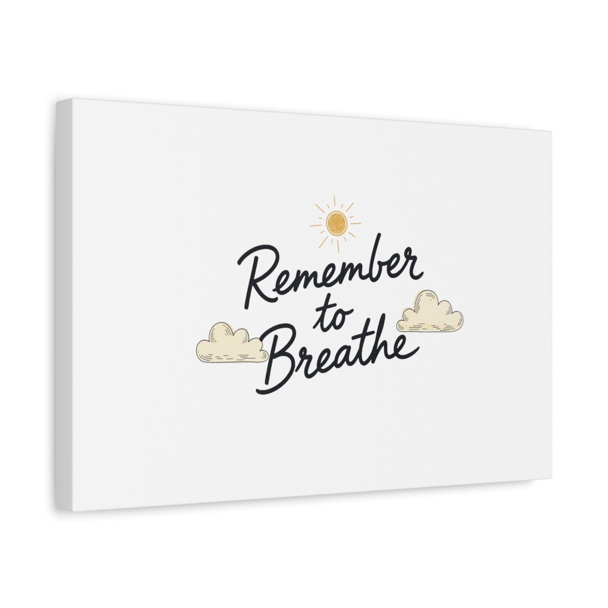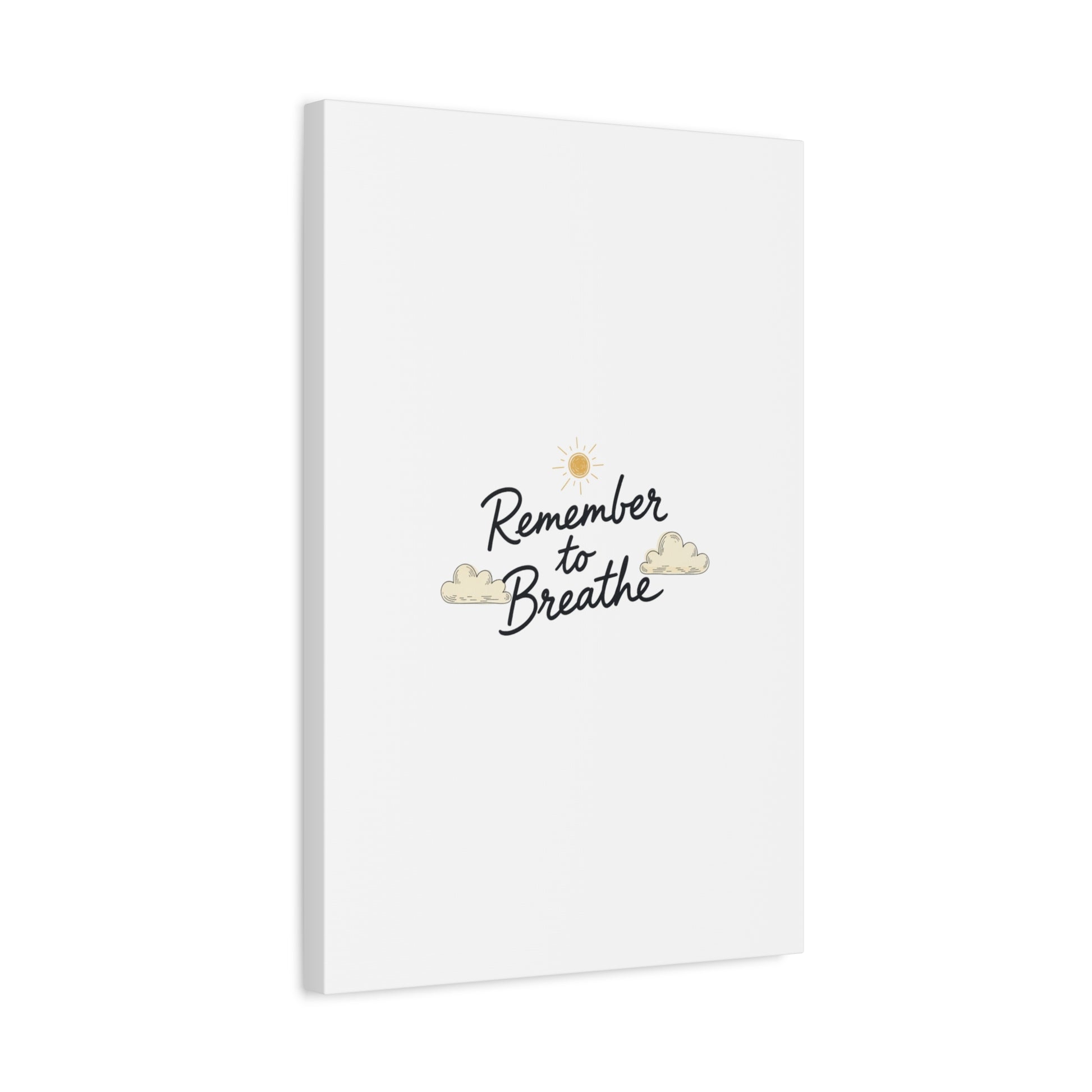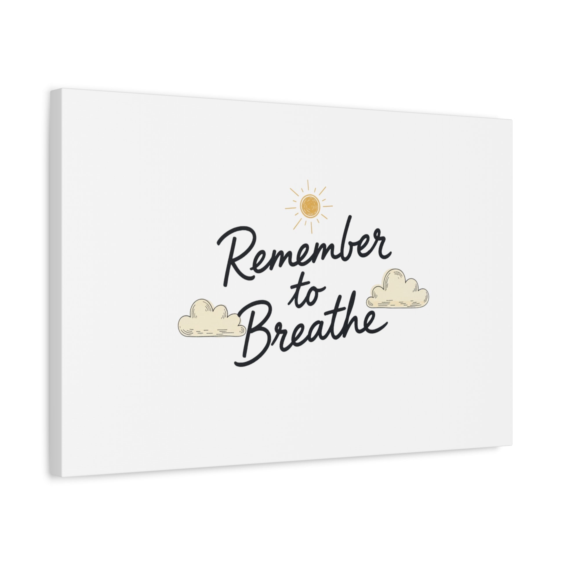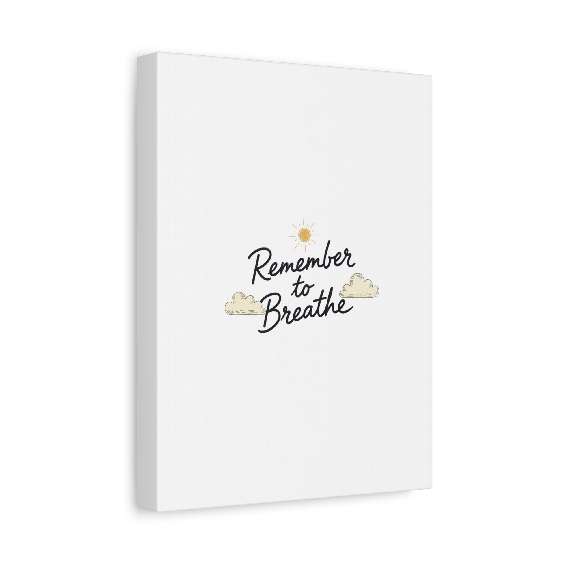 “Remember to Breathe” matte stretched canvas featuring a handwritten-style reminder in warm cream and inky tones. The artwork reads like a quick, analogue note—soft script text framed by a tiny sun and fluffy clouds—giving a gentle, therapy-adjacent vibe that fits the “Note to Self” analogue reminder aesthetic. Its understated palette and DIY-feel lettering make it a calm focal point for a desk nook, study wall, or bedroom where analog self-care cues belong.