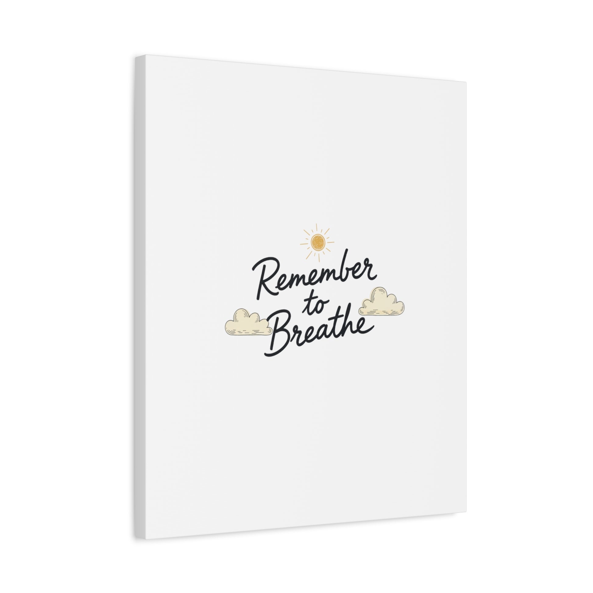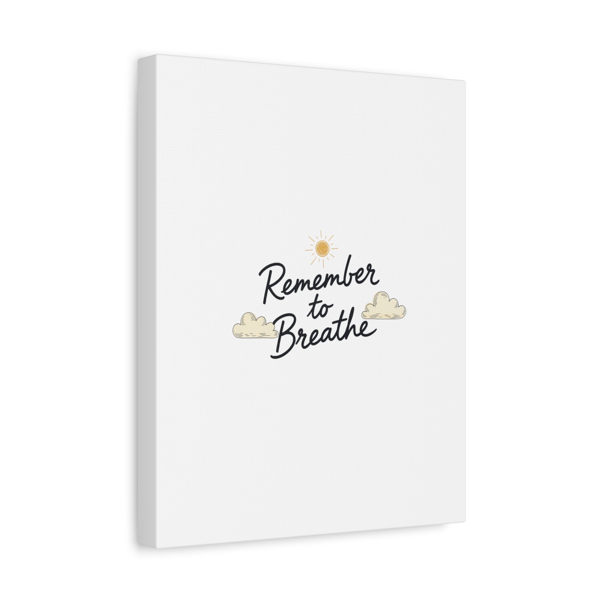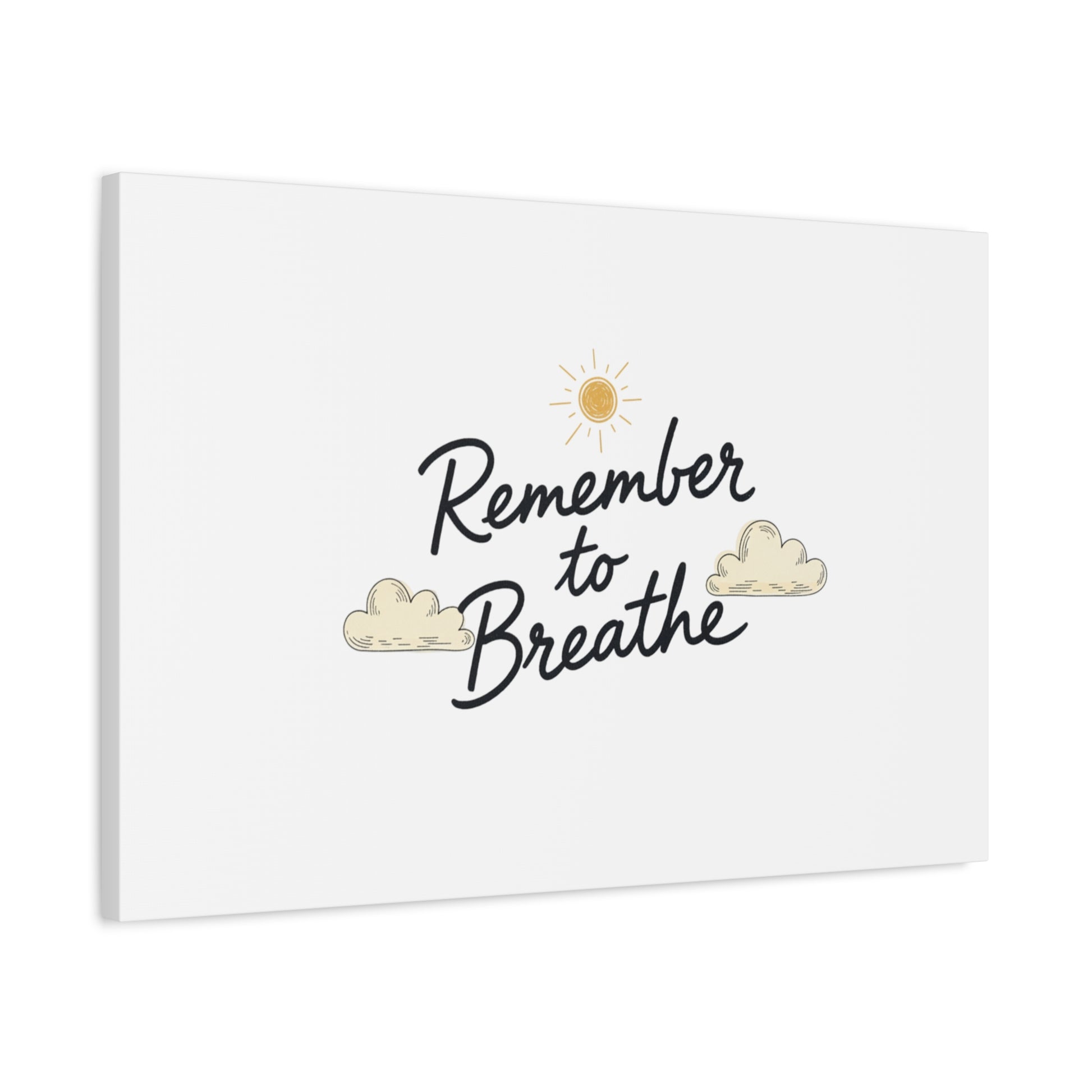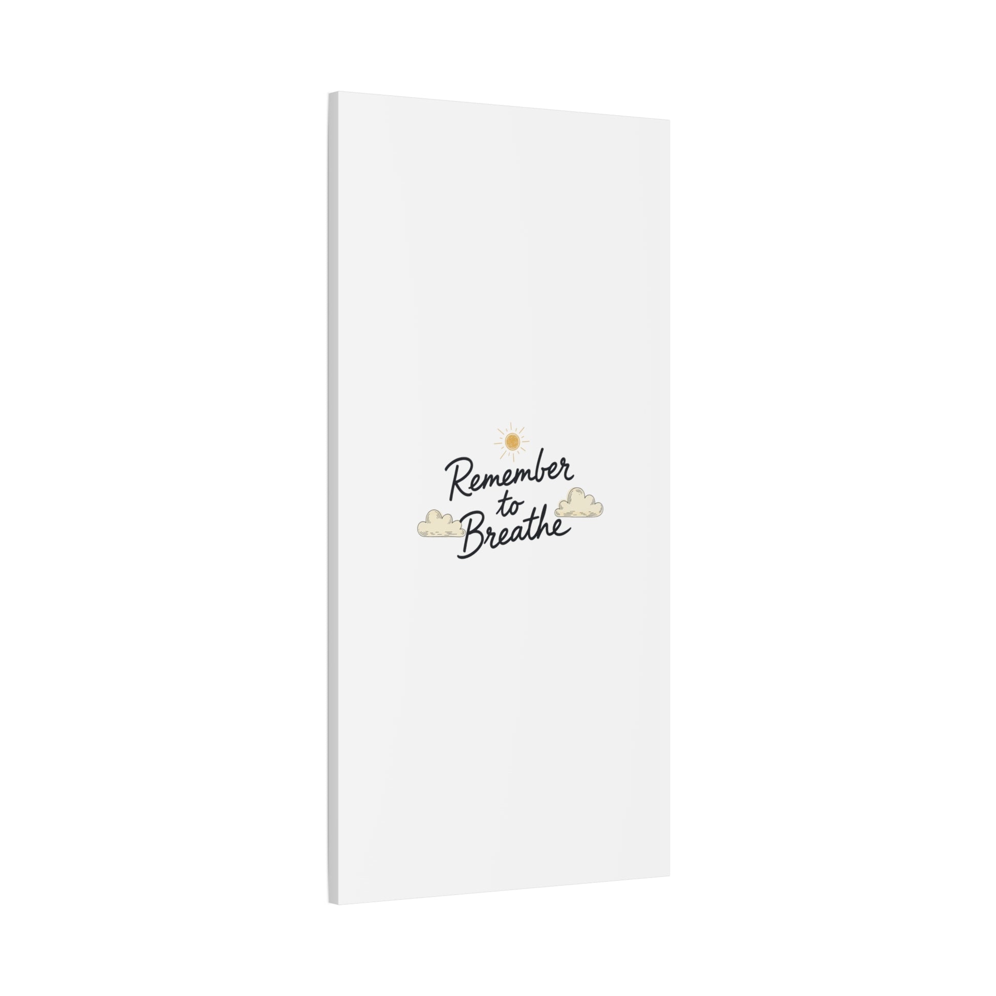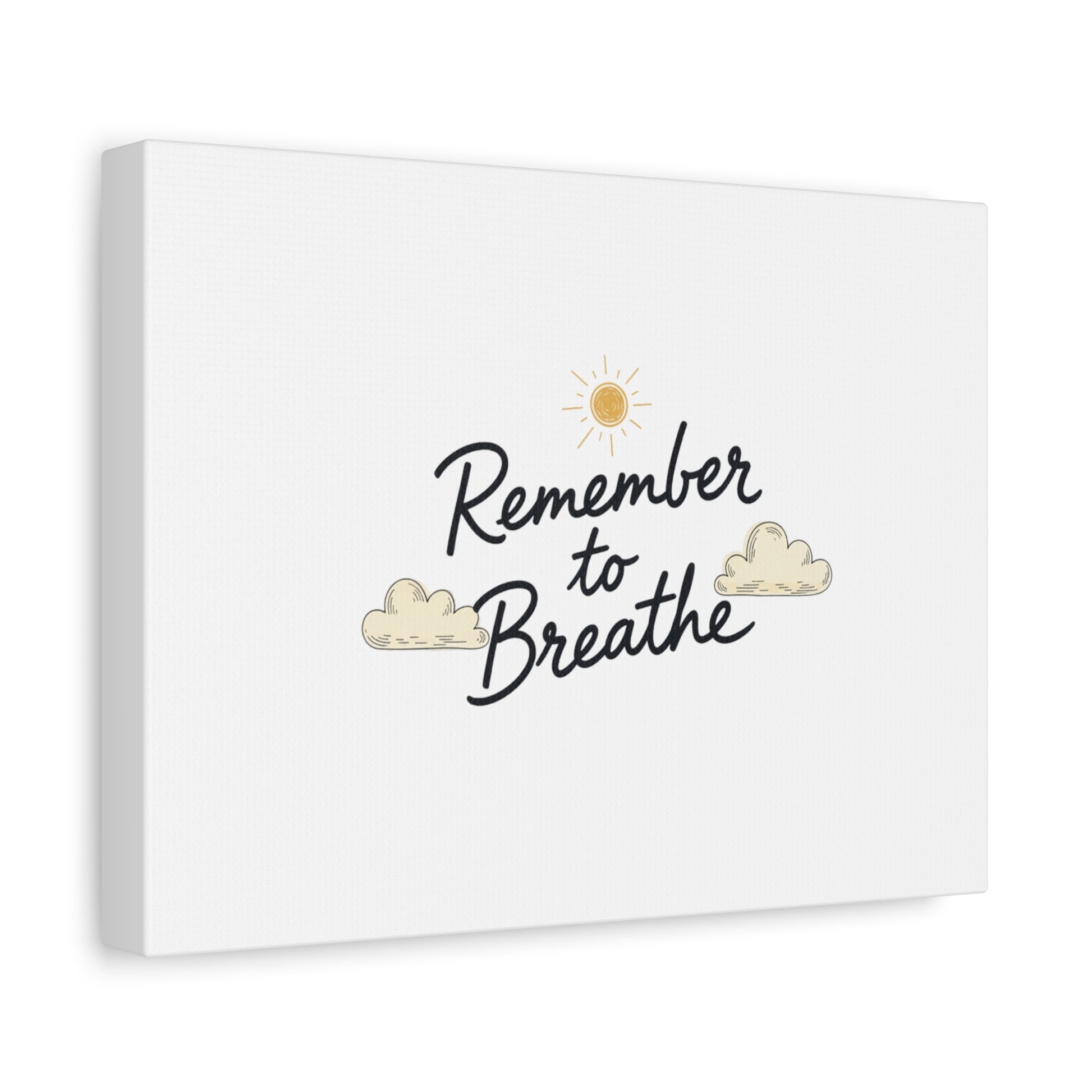 “Remember to Breathe” matte stretched canvas featuring a handwritten-style reminder in warm cream and inky tones. The artwork reads like a quick, analogue note—soft script text framed by a tiny sun and fluffy clouds—giving a gentle, therapy-adjacent vibe that fits the “Note to Self” analogue reminder aesthetic. Its understated palette and DIY-feel lettering make it a calm focal point for a desk nook, study wall, or bedroom where analog self-care cues belong.