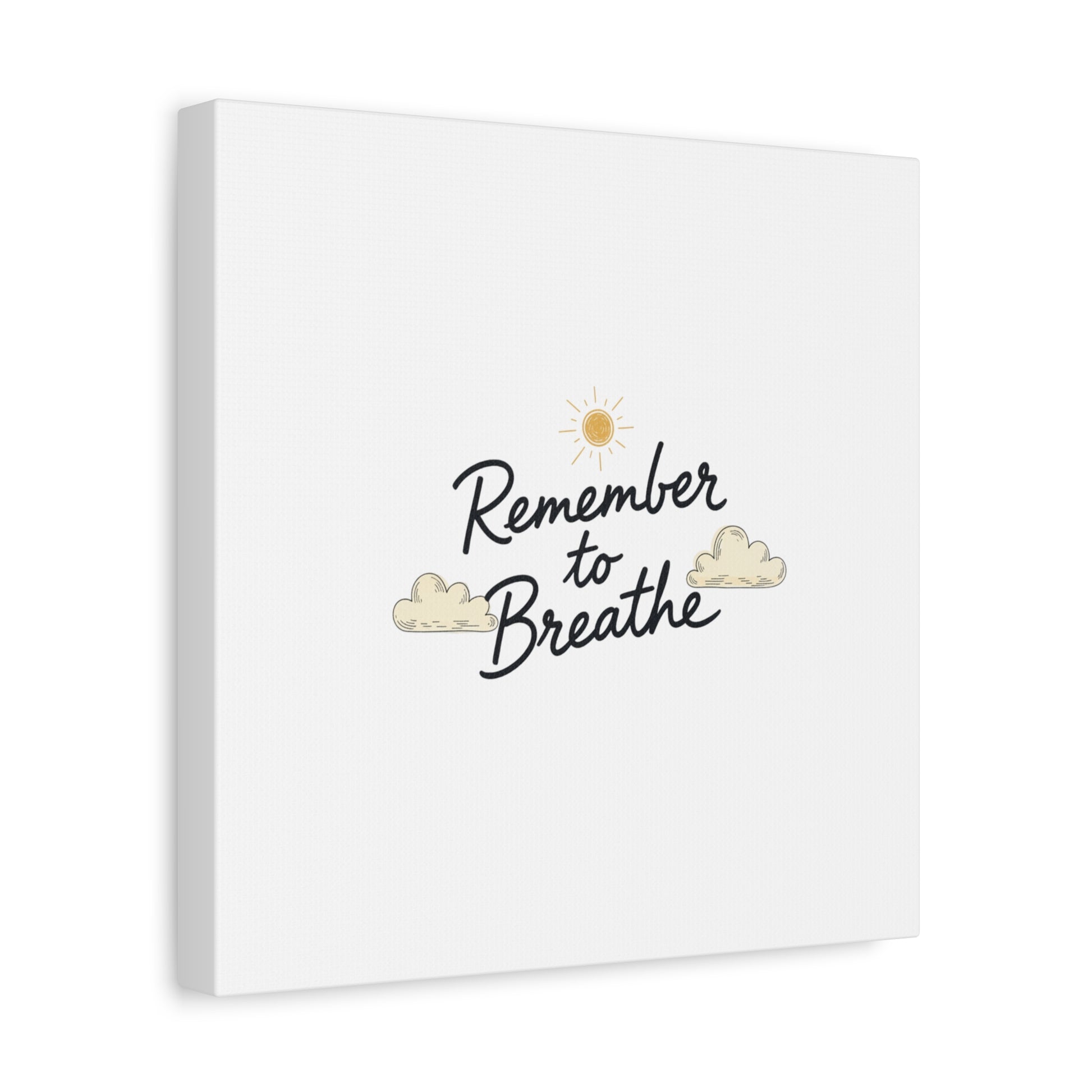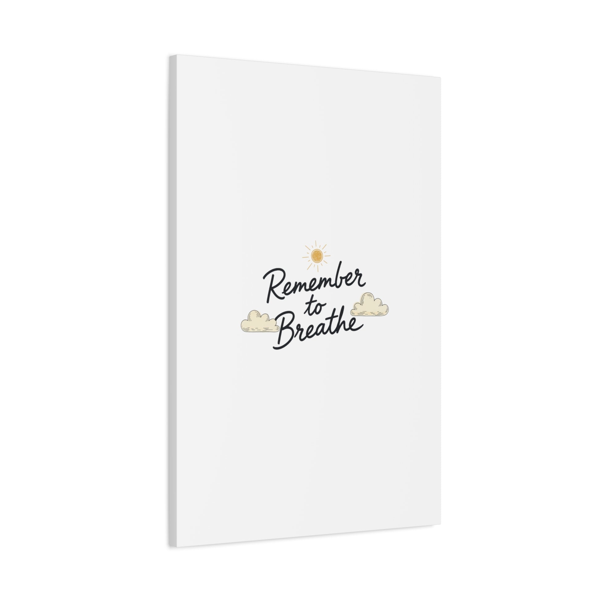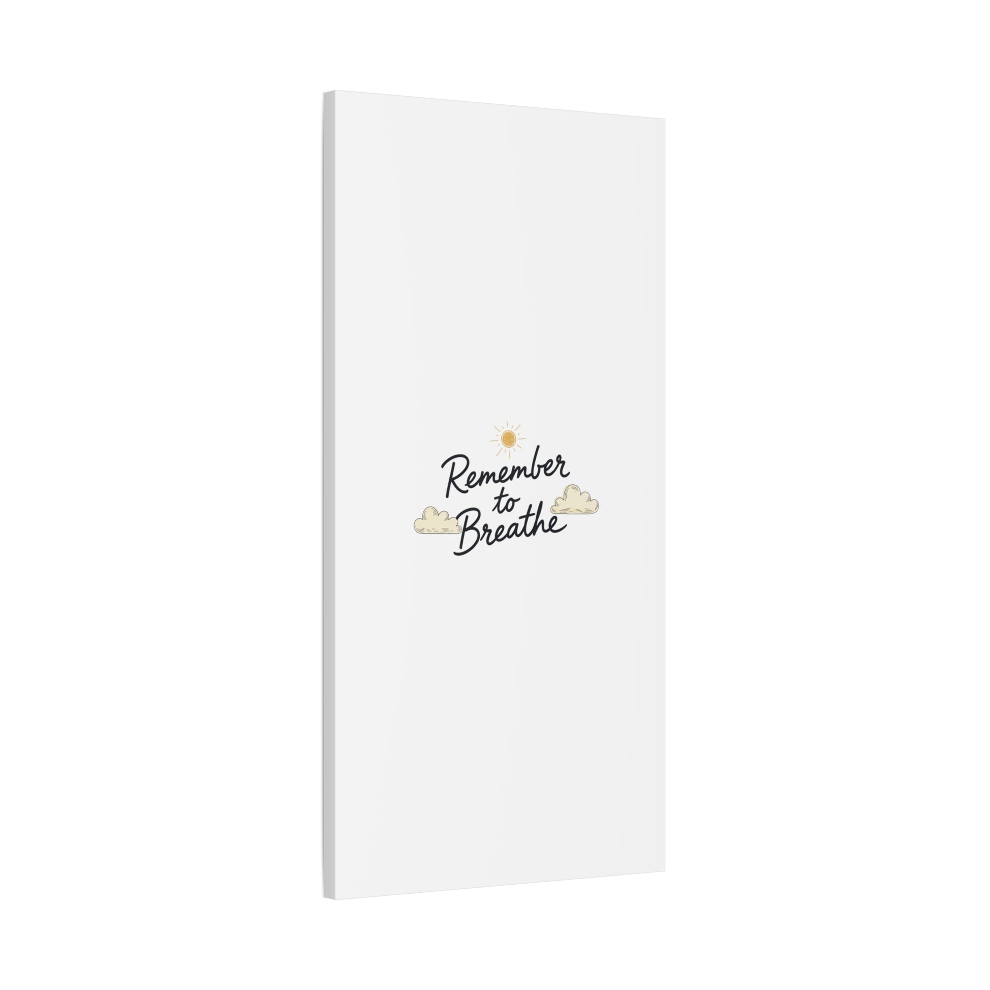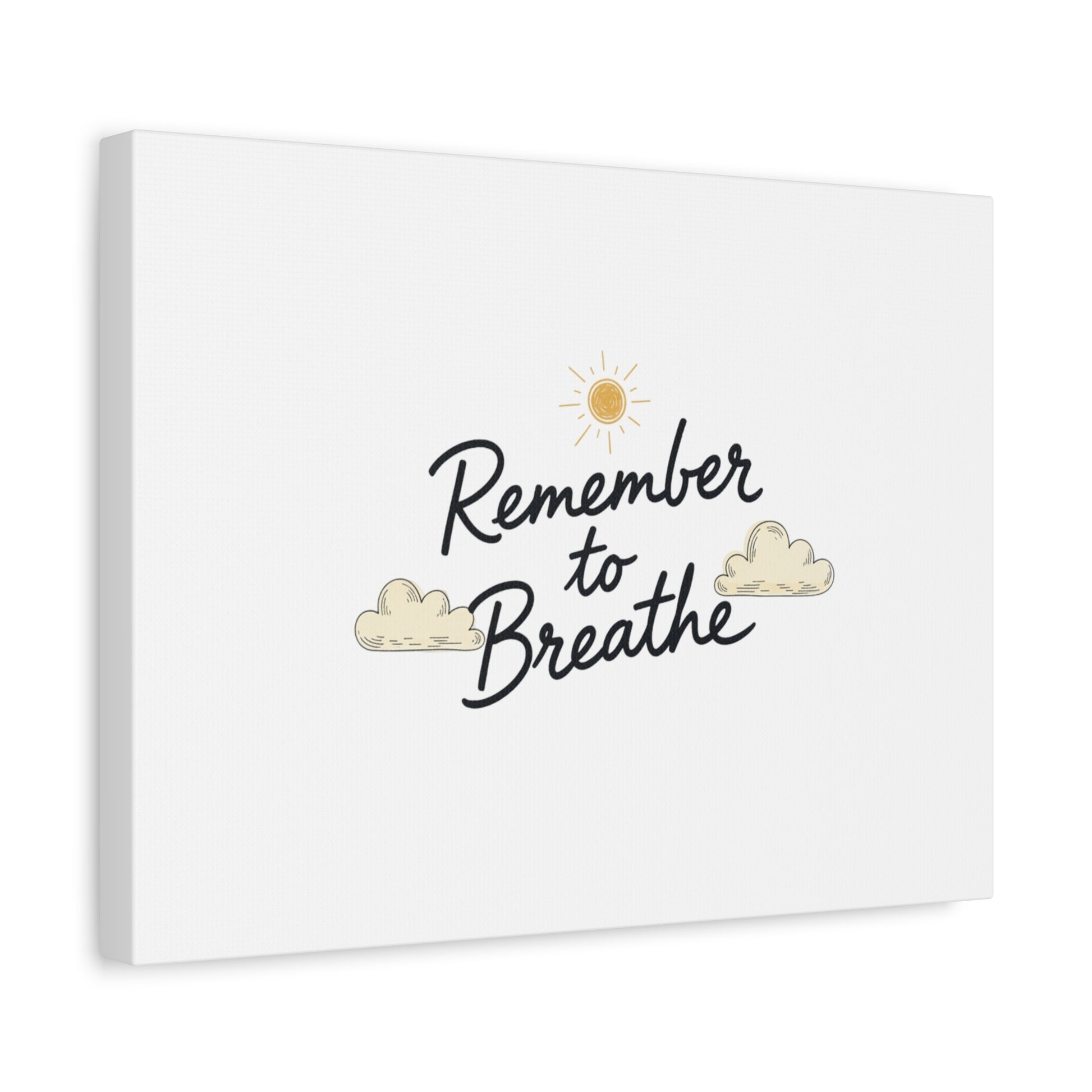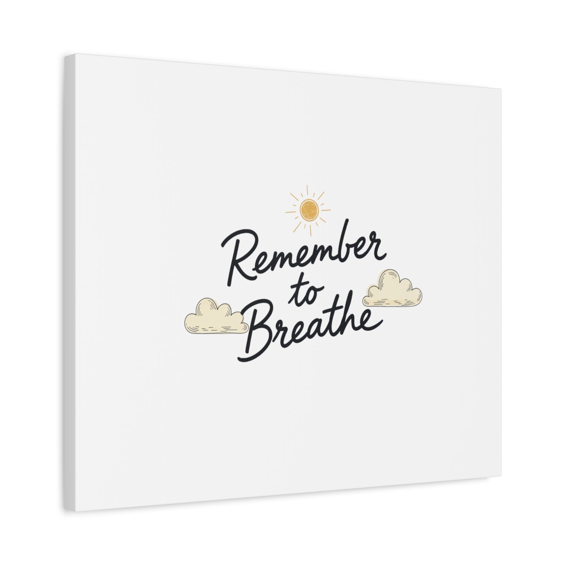 “Remember to Breathe” matte stretched canvas featuring a handwritten-style reminder in warm cream and inky tones. The artwork reads like a quick, analogue note—soft script text framed by a tiny sun and fluffy clouds—giving a gentle, therapy-adjacent vibe that fits the “Note to Self” analogue reminder aesthetic. Its understated palette and DIY-feel lettering make it a calm focal point for a desk nook, study wall, or bedroom where analog self-care cues belong.
