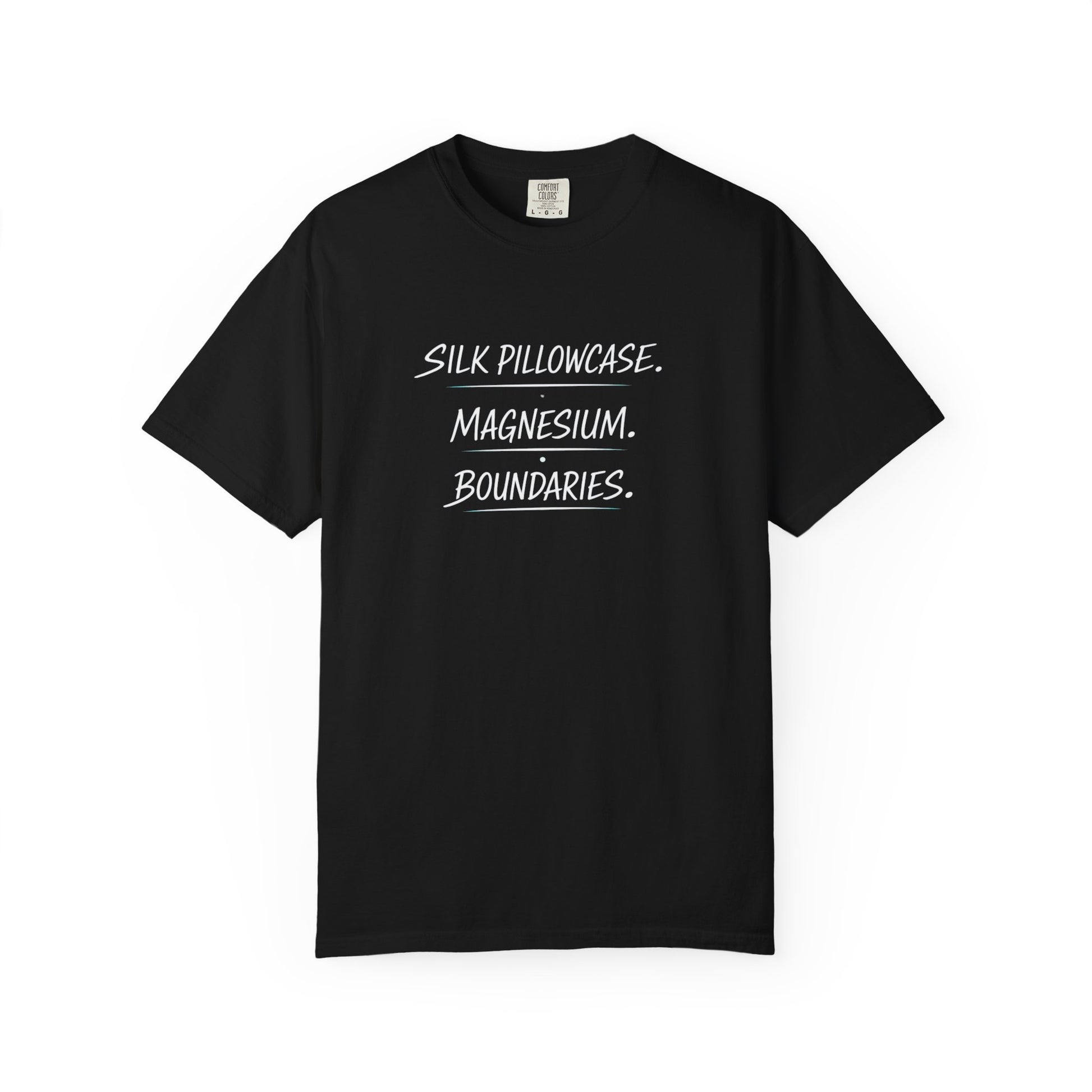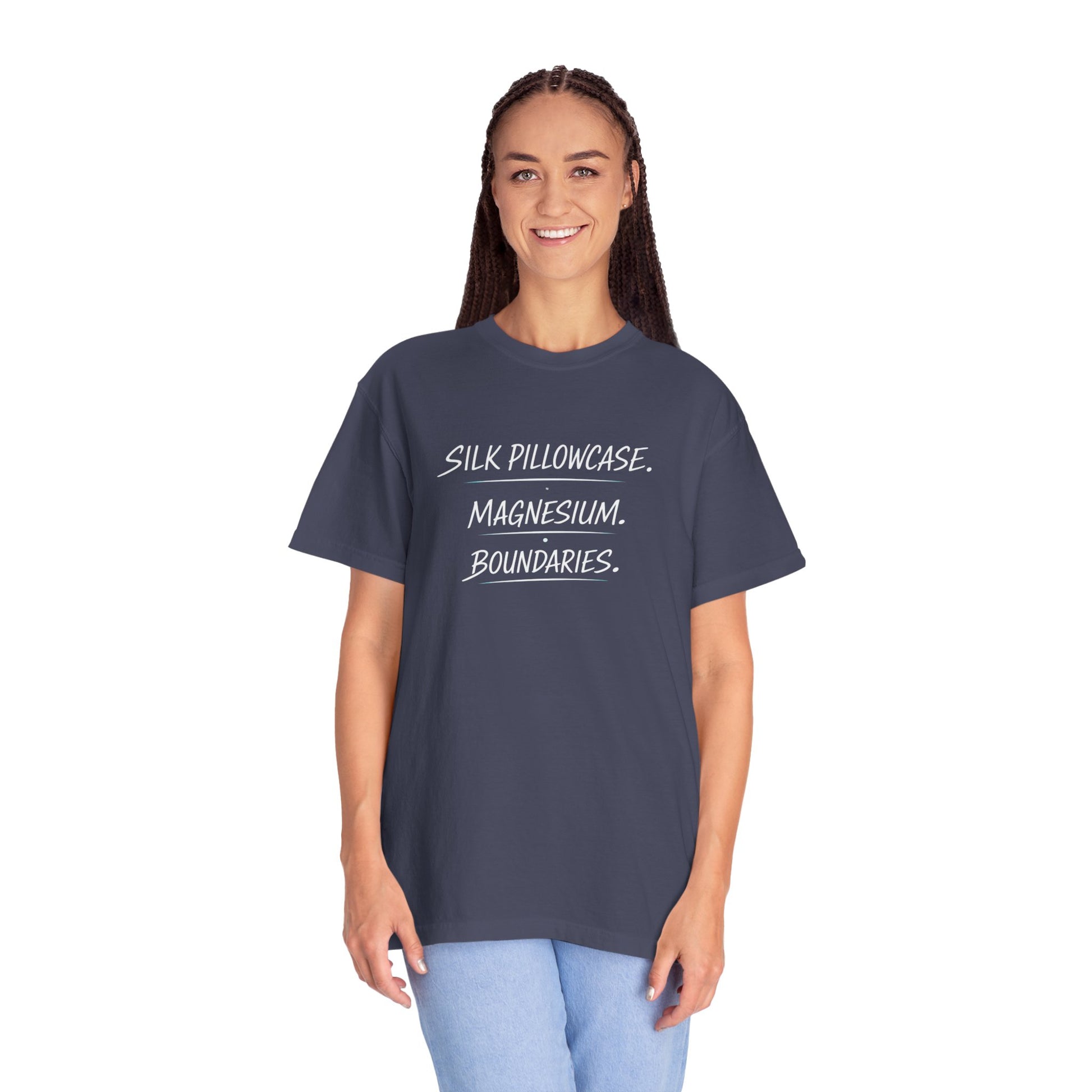 This relaxed, garment-dyed tee speaks softly and confidently. The front-hand text — “SILK PILLOWCASE. MAGNESIUM. BOUNDARIES.” — reads like a personal mantra for someone prioritizing self-care, restful nights, and clear limits. The heavyweight, ring-spun cotton softens with wear and the dye-after-construction finish gives the shirt a lived-in, cozy texture and muted color that pairs easily with jeans or lounge wear. It sits loosely on the body without feeling sloppy, a quiet staple for mornings with a warm drink, low-key meetups, or evenings spent unwinding. Wear it when you’re leaning into routines that actually protect your energy, or gift it to a friend who collects small rituals and bold reminders.