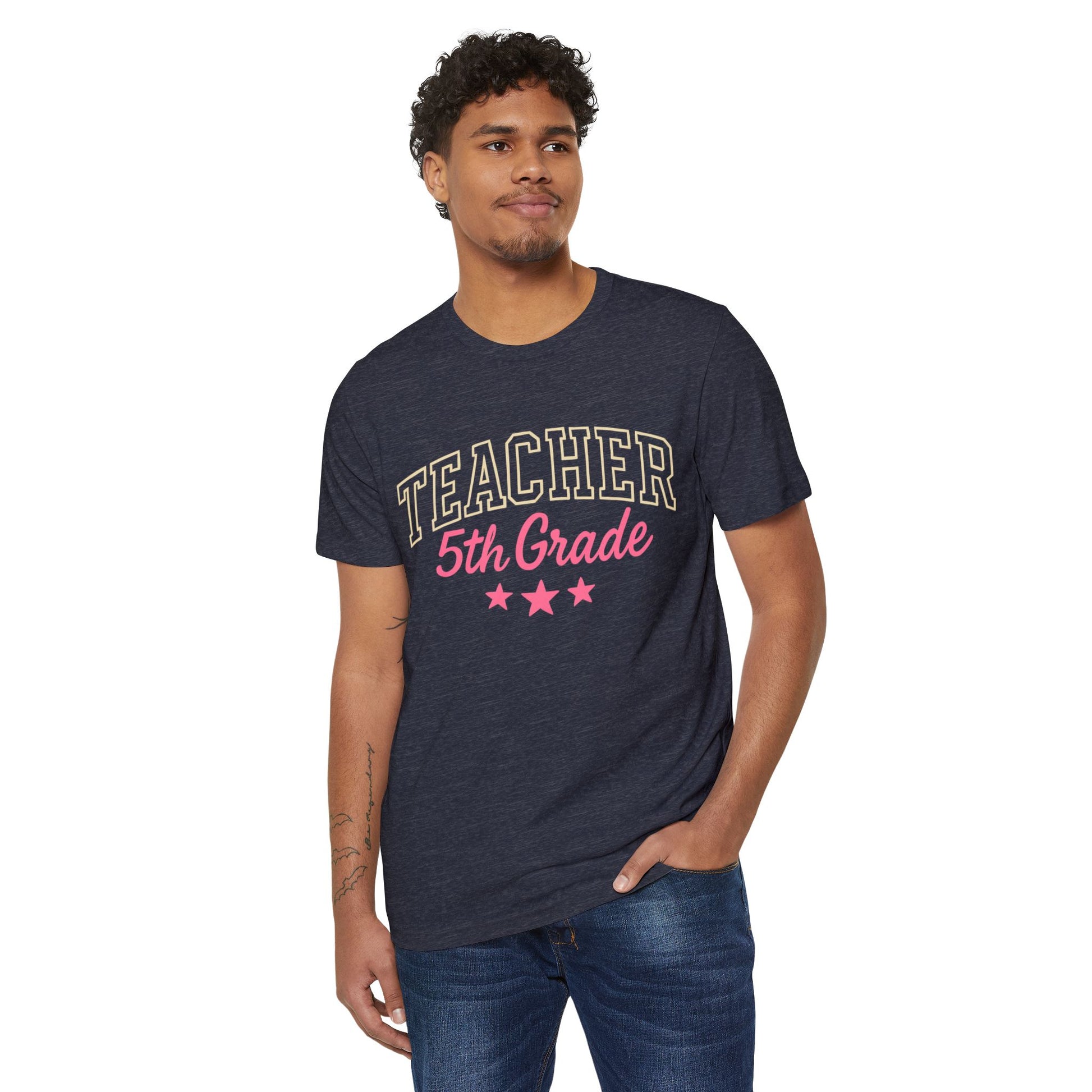 Soft, lightweight, and sustainably made, this tee celebrates classroom champions with subtle vintage flair. The high, scoop neckline and semi-relaxed cut create an easy silhouette that layers well under cardigans or pairs simply with jeans. The front design reads “TEACHER” with “5th Grade” below and three stars, rendered in warm cream and playful pink — an understated nod to pride and everyday victories. Breathable Airlume organic cotton blended with recycled polyester keeps it cool during long school days, while shoulder tape and a tear-away label make it durable and comfortable through repeated wear and washes. Wear it on parent-teacher nights, casual school outings, or when you need a friendly reminder of the impact you make each day.