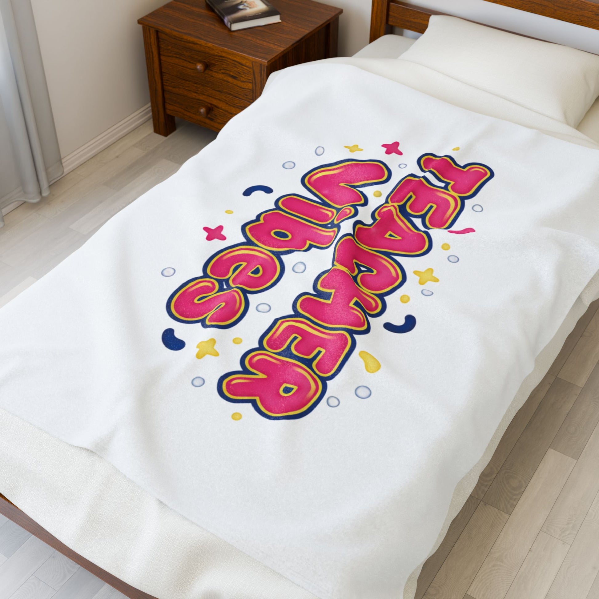 Bright, squishy neon lettering brings Dopamine Decor energy to a soft velveteen blanket designed for everyday cozy moments. The artwork features rounded, bubble-style type in high-saturation pinks and warm accents, framed by tiny playful shapes that echo Y2K nostalgia and the trend’s joyful, sensory aesthetic. One-sided vibrant print on a silky-feeling polyester surface makes the color pop while the medium heavy-weight fabric keeps the blanket comfortably substantial for lounging, layering on a sofa, or draping over a reading chair.