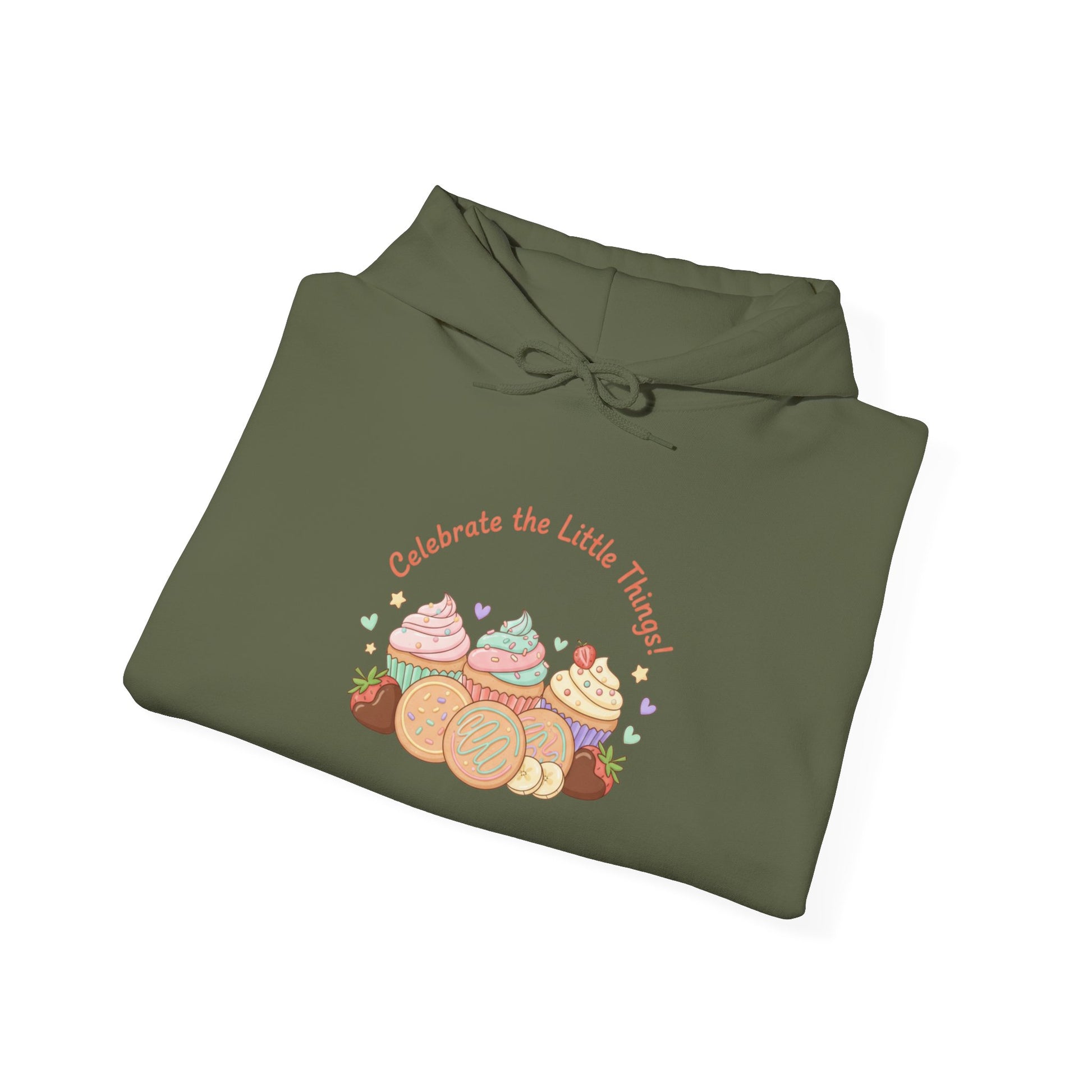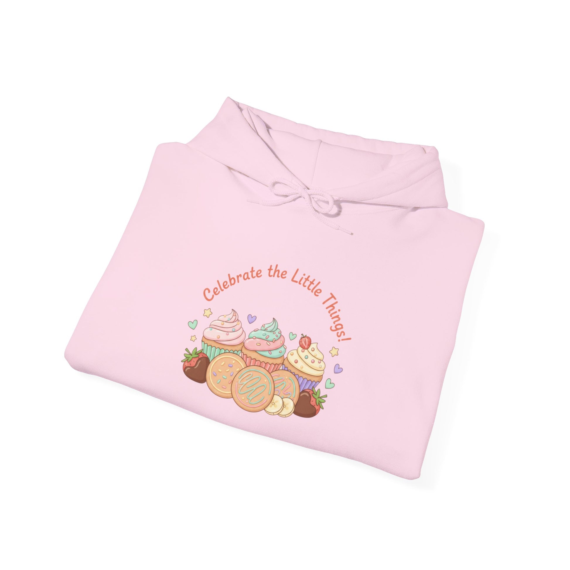 A cozy pastel hoodie featuring a tiny, centered illustration of miniature desserts and a short, upbeat line that celebrates small self-rewards. Soft, rounded shapes and candy-colored tones give the artwork a playful, dopamine-forward vibe that fits the Tiny Treats / Little Rewards trend—an easy layer for study breaks, commute comfort, or low-key weekends when a tiny indulgence brightens the day.
